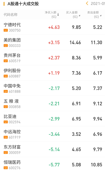 北上资金今日净买入宁德时代4.63亿元,为今日买入之最。此外,北上资金净买入美的集团3.15亿港元,净买入贵州茅台2.37亿港元。