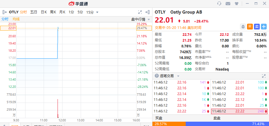 华盛资讯5月20日消息,燕麦奶巨头Oatly Group AB(OTLY)今日挂牌纽交所,股价高开近30%,报22.01美元。