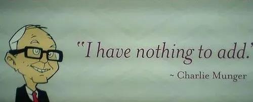 听过郭德纲相声的票友大都有一个同感,郭德纲的每个段子都离不开他20年的老搭档于谦。 而看过巴菲特股东会的大家估计也有一个同感,巴菲特的每个回答都离不开他60年的搭档芒格。 每段发言结束后,他都会转过头去问一下芒格“你有什么要补充的吗?” 芒格的回答总是:I have nothing to add(我没有什么要补充的) 。 这两句对话几乎成了年会的标志性对话。 以至于某一年,爱开玩笑的巴菲特,弄了个纸板的芒格放在自己旁边,用录音机录下芒格的话,时不时问一下纸版的“芒格”:“你认为呢?” 然后自己用录音机放出芒格的声音:“我没有什么要补充的”,并露出小孩般的顽皮笑脸。