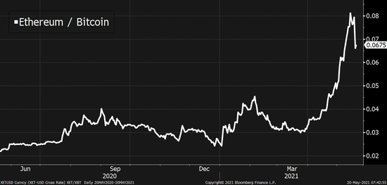 下面这张图可以看出,以太坊与比特币的相对价格在过去一年上涨了多少,尤其是最近几个月: