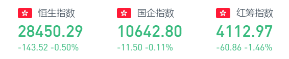 周四,恒生指数开盘跌0.63%,全天呈窄幅震荡走势。截至收盘,恒生指数跌143.52点或0.5%,报28450.29点,全日成交额达1687.93亿。国企指数跌0.11%,报10642.8点,红筹指数跌1.46%,报4112.97点。