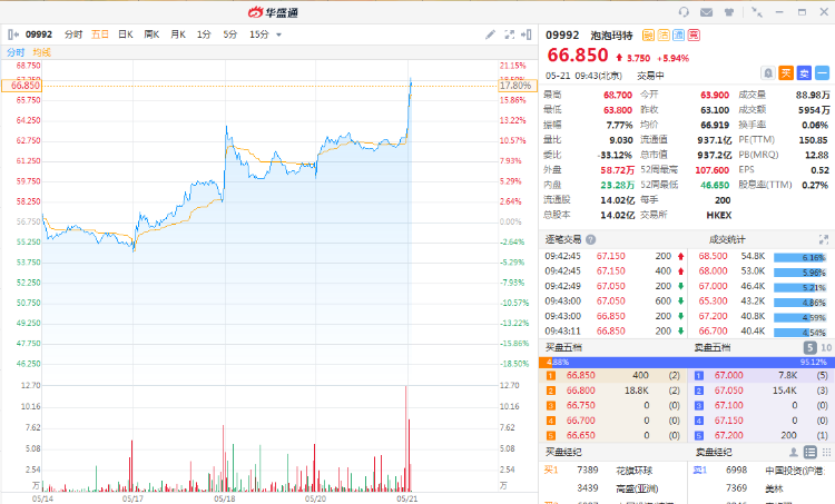 5月21日消息,泡泡玛特涨5.94%,现报66.85港元,最新市值937亿港元。