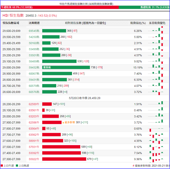 街货分布方面,至周四,恒指牛证街货在收回价27600点至28300点之间,已累计约1407张期指合约;恒指熊证街货在收回价28600点至29200点之间,累计相当约2554张期指合约。