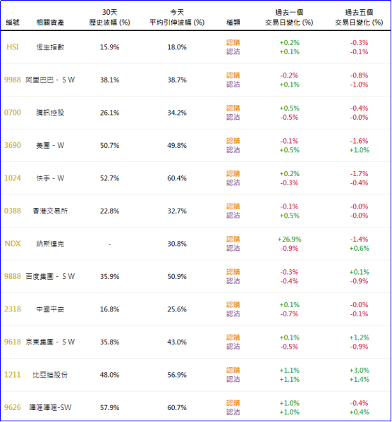 周四恒指相关权证的平均引伸波幅报约18.0%,按日小幅调升。个股方面,腾讯、快手、比亚迪股份、哔哩哔哩等相关认购证的引伸波幅亦按日调升;腾讯、快手、百度、平安、京东相关认沽证的引伸波幅则按日下降。
