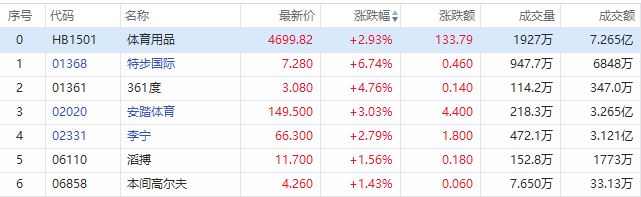 华盛资讯5月21日消息,今日港股体育用品板块普涨,截止发稿,特步国际涨超6%;361度涨超4%;安踏体育涨超3%;李宁涨超2%。