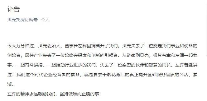 5月20日下午,贝壳找房发布公告称,公司创始人兼董事长左晖因疾病意外恶化于2021年5月20日去世,时年50岁。