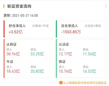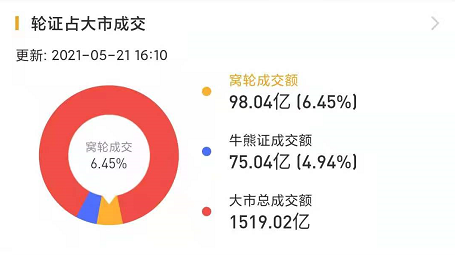 其中,窝轮总成交98.04亿港元,牛熊证总成交75.04亿港元。
