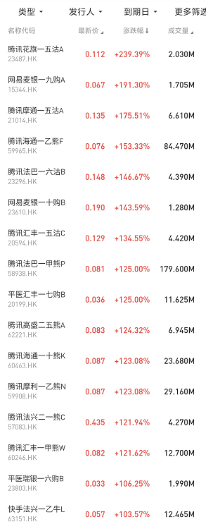 数据显示,今日腾讯共有12只认沽证或熊证涨幅超100%。