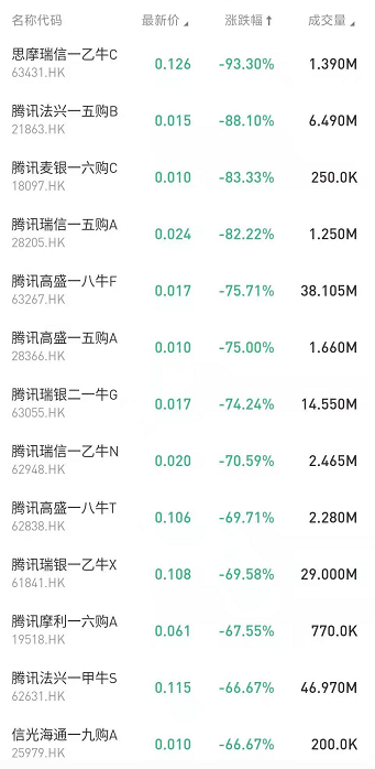 今日腾讯有19只认购证或牛证跌幅超过60%。