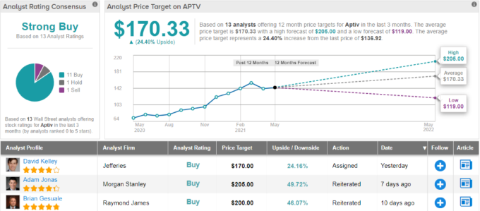 从华尔街总体来看,有11位分析师建议买入Aptiv、1位建议持有、1位建议卖出,该股共识评级位“强烈买入”,平均目标价位170.33美元,意味着其股价较当前水平存在24%的上升空间。