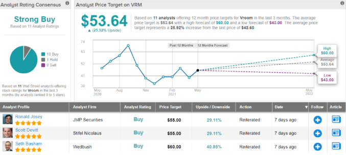 从华尔街追踪Vroom的分析师来看,基于10个买入评级、1个持有评级,该股共识评级为“强劲买入“,平均目标价为53.64美元,意味着未来12个月其股价存在约26%的上升空间。