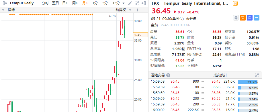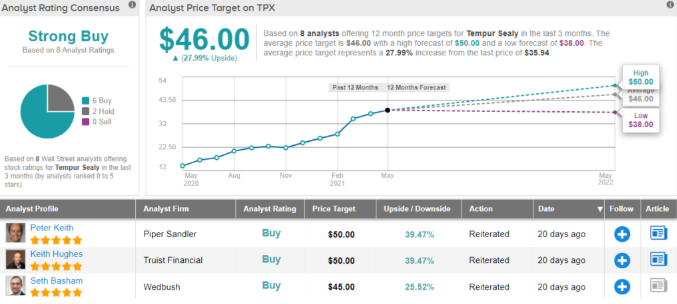 华尔街显然对TPX未来同样看涨,基于6个买入评级、2个持有评级,该股共识评级为“强烈买入”,平均目标价46美元,意味着较当前水平存在28%的上升空间。
