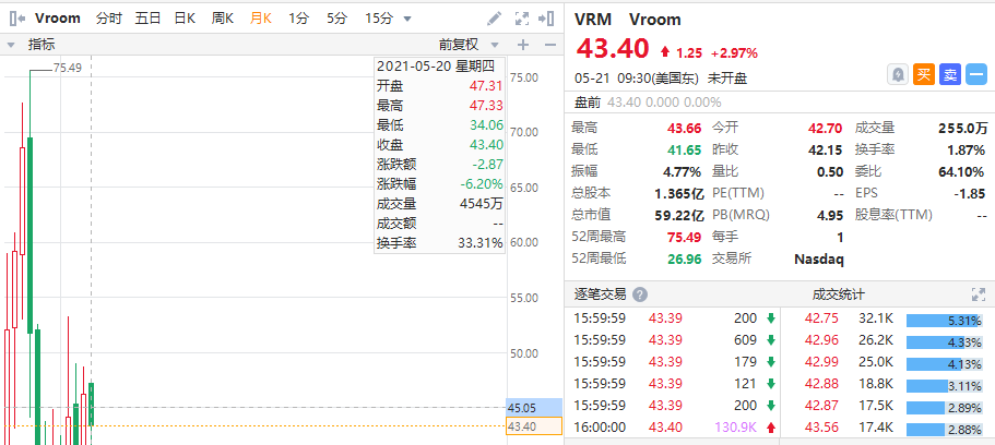 今年第一季度,桥水基金在Vroom上市时买进逾4.7万股股票,目前价值约201万美元。