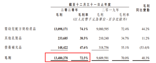 飞鹤2020年年报显示,2020年飞鹤全年实现营收185.93亿元,净利润74.37亿元,与此同时,高达72.5%的毛利率格外显眼,直追五粮液2020年84.9%的毛利率。
