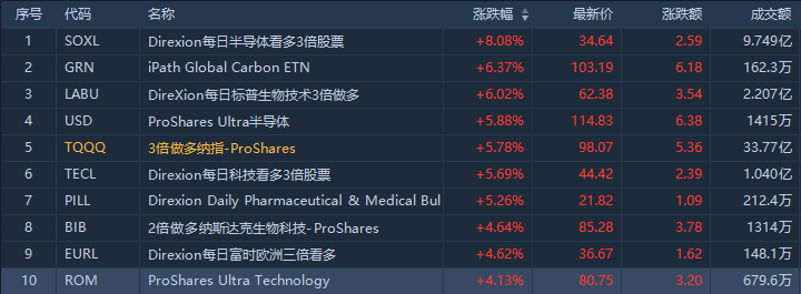 周四,美股结束此前连续三天的跌势,随着科技股强劲反弹,三大股指全线收涨,纳指涨近2%,科技股、芯片股、区块链股集体上涨。从ETF涨幅榜来看,居首位的是Direxion每日半导体看多3倍股票涨8.08%,成交额9.749亿美元;其次,iPath Global Carbon ETN涨6.37%。