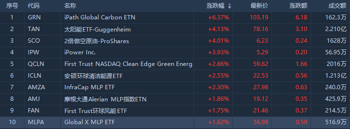 隔夜市场,能源类ETF表现强势。iPath Global Carbon ETN收涨6.37%,成交额达162.3万美元;太阳能ETF-Guggenheim涨4.13%,成交额达2.21亿美元;2倍做空原油-ProShares涨近4%,成交额达1628万美元。