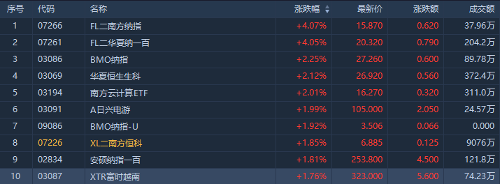 今日涨幅位居前的ETF有FL二南方纳指(07266.HK),收涨4.07%,成交额达37.96万港元;FL二华夏纳一百(07261.HK)收涨4.05%,成交额达204.2万港元;BMO纳指(03086.HK)涨2.25%,成交额89.78万港元。