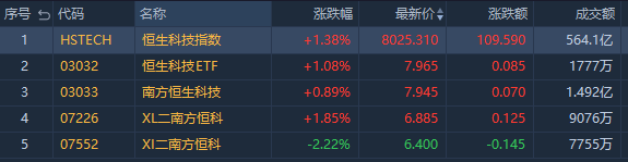 今日恒生科技指数收涨1.38%。看多恒指相关ETF走强,南方两倍做多恒科(07226.HK)涨1.85%,成交额约9076万港元;南方恒生科技(03033.HK)涨0.89%,成交额约1.492亿港元;