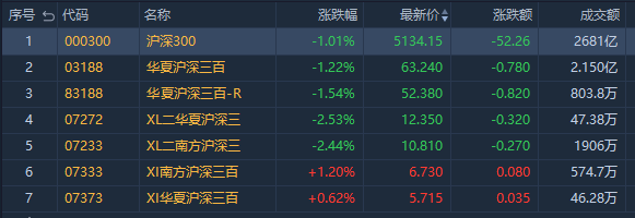 沪深300指数收跌1.01%。其中,华夏沪深三百-R(83188.HK)跌1.54%,成交额达803.8万港元;华夏沪深三百ETF(03188.HK)跌1.22%,成交额约2.15亿港元。