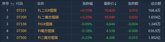 跌幅居前的是FI二南方恒指(07500.HK)跌0.23%,成交额1.902亿港元。
