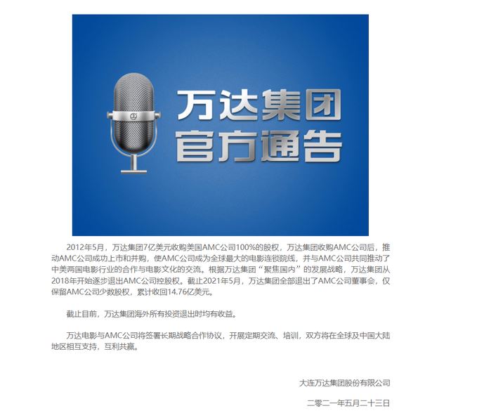 从2018年起,万达开始逐步减持AMC。去年10月,万达还持有AMC近40%的股权,如今已降至0.002%。5月23日,大连万达集团在其官网发布消息称,公司已全部退出了AMC董事会,仅保留少数股权,累计回笼资金14.76亿美元(约合人民币94.96亿元)。这较公司7亿美元的实际现金投资增长100%。