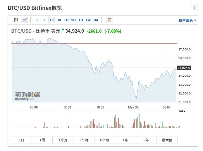 周日,比特币价格再次直线下跌,这个世界第一加密货币的价格从4月中旬前后的峰值下跌了50%以上,数字资产领域又出现了一轮动荡。据最新数据显示,比特币下跌7.08%,为34924美元,此前曾触及24小时低点31179美元,较4月中旬的高点64829.14美元减少了一半。