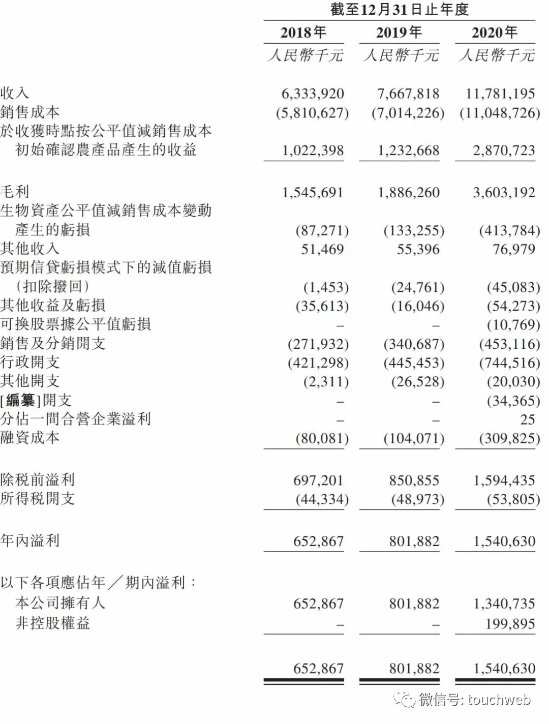 优然牧业2018年、2019年、2020年年内盈利分别为6.5亿元、8亿元、15.4亿元。