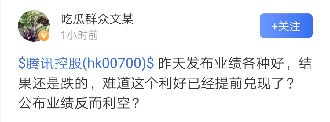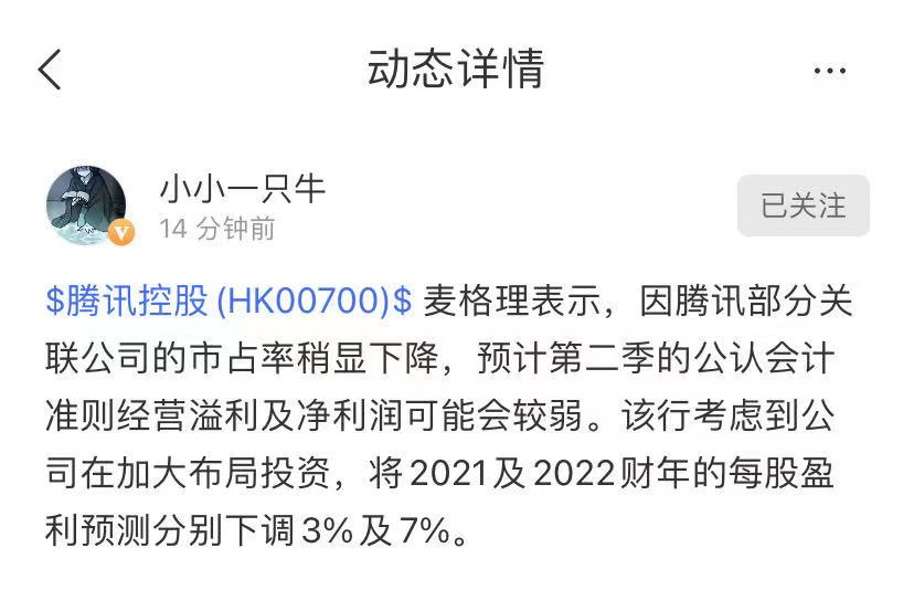 @小小一只牛引用了麦格理的研究,预计腾讯部分关联公司市占率稍显下降,预计第第二季净利润可能相对较弱,还有一点就是腾讯考虑加大投资,这些投资短期可能不会产出超额利润,可能使第二季净利润承压。