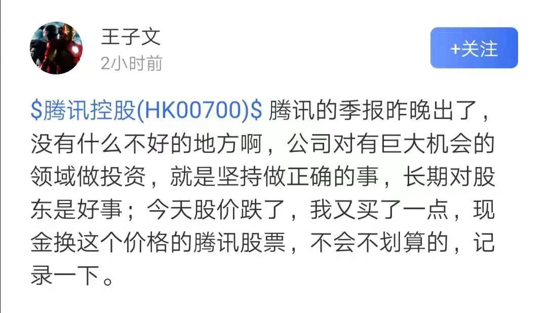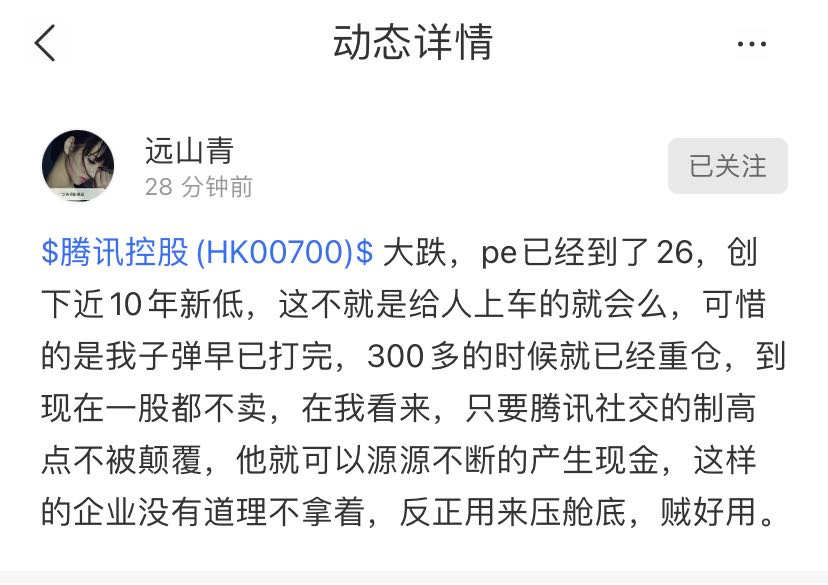 比如@远山青 就认为现在是千载难逢的机会!腾讯PE已创下近十年新低,十年一遇的大机会,趁势抄底,小心错过拍大腿。