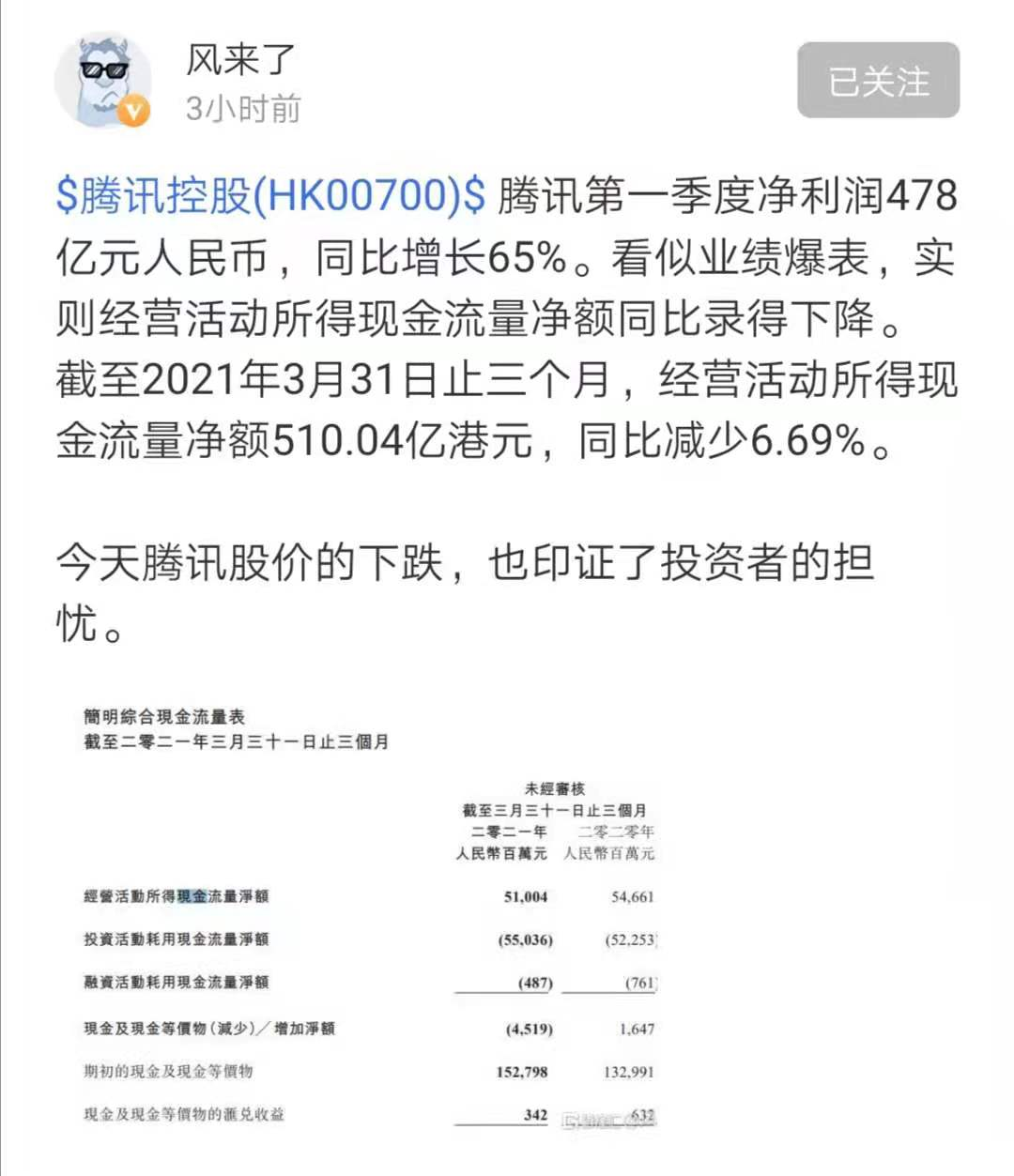 他指出:腾讯业绩看似爆表,实则经营活动现金流大幅减少。