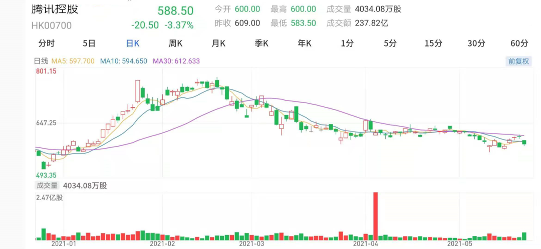开盘绿色,本韭知道要糟。果不其然,今日腾讯控股走势呈现低开低走,开盘600港币到了收盘,只剩下586港币了,今日跌幅3.28%。