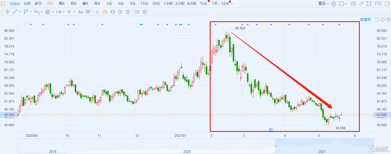 牛年开市以后,海底捞惨遭市场抛弃。股价从历史最高价85.8港元直泻至近期最低的40.6港元,累计跌幅高达50%,市值蒸发超过2000亿港元。
