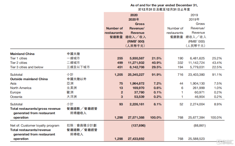 此外,截止2020年末,海底捞经营餐厅总数为1298家,同比大幅增长近70%。全年餐厅服务顾客超2.5亿人,同比增长仅2.5%。