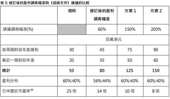 调高200%的逻辑,则是按恒生指数的平均收报点数由1994年盈利规定推出实施时的9541 点上升至2019年的27569点的概约增幅调高。