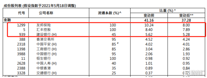 其中友邦保险的权重下调最大,从变动前的10.24%降为8%的顶格标准,汇控也有8.4%降到了7.89%,建行的权重从5.62%降至5.28%。