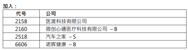 恒生综合指数的成份股数目增加了4只增加至506只,被纳入的个股中3家都是医疗股:医渡科技、心通医疗、汽车之家、诺辉健康。