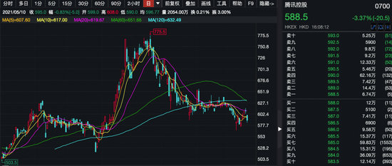 在多篇“偏空”报告下,5月21日,腾讯股价单边下跌,最高跌幅超4%,收于588.5元/股,跌幅为3.37%。而拉长周期来看,自今年2月以来,腾讯股价一直处于深度调整中,已从最高点775.5元/股下跌了24%。