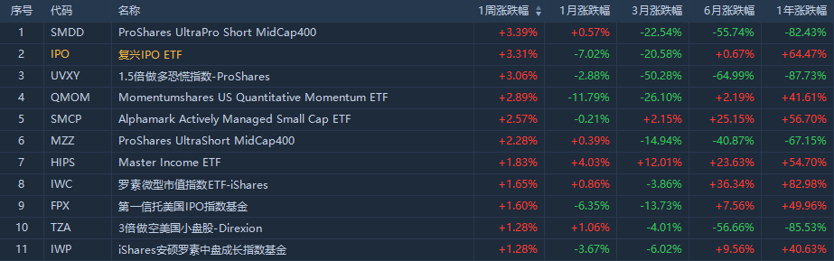 美股大型股指方面,受美股大盘表现疲弱和市场恐慌情绪较强影响,位居ETF涨幅榜首位的是3倍做空标普中盘股400指数的ETF(SMDD),本周收涨3.39%;追踪美股新股的ETF复兴IPO 收涨3.31%;1.5倍做多恐慌指数ETF(UVXY)上涨3.06%。