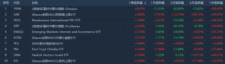 此外,新兴市场相关的ETF表现亦不俗。其中,iShares安硕MSCI阿联酋上限ETF收涨4.85%;新兴市场网络与电子商务ETF(EMQQ)上涨3.79%。