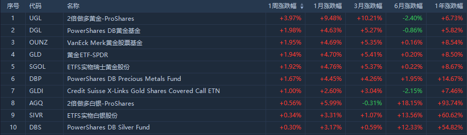 本周金价震荡攀升,上涨37.82美元,涨幅2.05%,盘中最高价格触及四个月新高。做多黄金和黄金基金相关ETF涨幅居前,其中2倍做多黄金ETF(UGL)收涨3.97%;PowerShare DB黄金基金ETF(DGL)上涨1.98%。