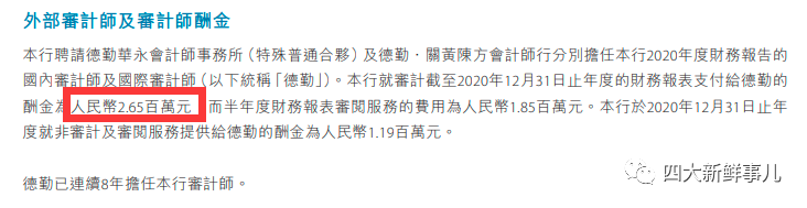 根据公司2020年年度报告披露,该公司2020年度支付给德勤2.65百万元的审计费用。