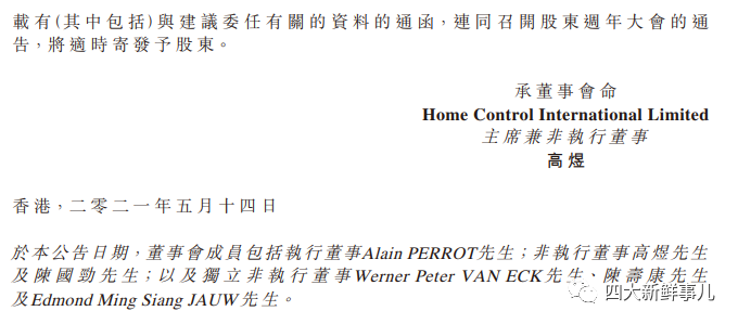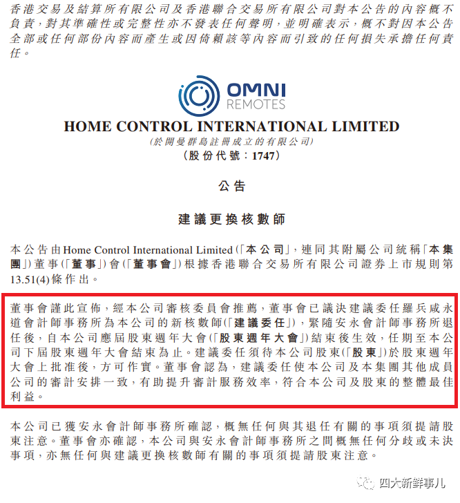 HOMECONTROL于5月14日发布的《建议更换核数师》显示,经该公司审核委员会推荐,董事会已议决建议委任罗兵咸永道会计师事务所为该公司的新核数师,紧随安永会计师事务所退任后,自该公司应届股东周年大会结束后生效,任期至该公司下届股东周年大会结束为止。