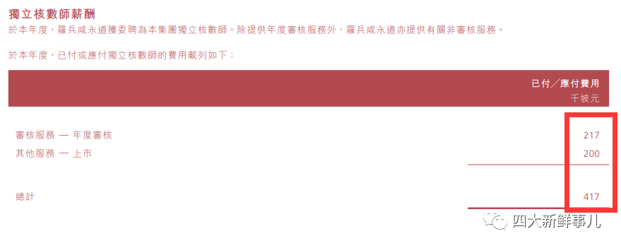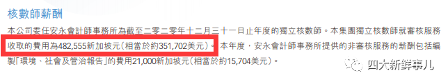根据公司2020年年度报告披露,该公司2020年度支付给罗兵咸永道417,000新加坡元(折合人民币约201万元,其中审计费约105万元)。
