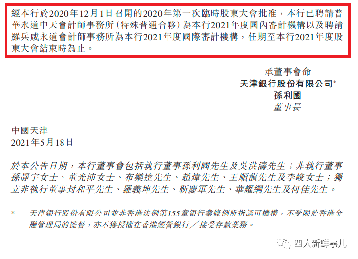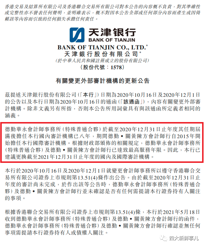天津银行于5月18日发布的《有关变更外部审计机构的更新公告》显示,根据相关规定,德勤华永会计师事务所(特殊普通合伙)及德勤关黄陈方会计师行已达致最高服务年限。因此,该行已建议更换截至2021年12月31日止年度的国内及国际审计机构。经该行于2020年12月1日召开的2020年第一次临时股东大会批准,该行已聘请普华永道中天会计师事务所(特殊普通合伙)为该行2021年度国内审计机构以及聘请罗兵咸永道会计师事务所为该行2021年度国际审计机构。