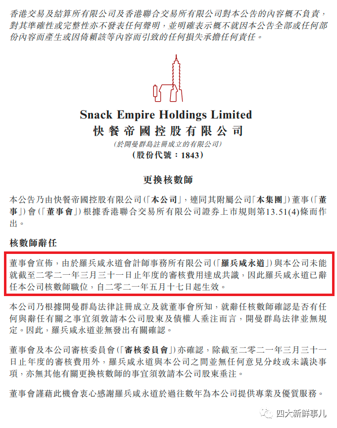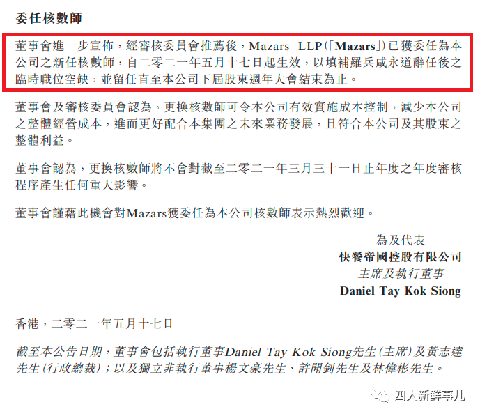 快餐帝国于5月17日发布的《建议更换核数师》显示,由于罗兵咸永道会计师事务所有限公司与本公司未能就截至二零二一年三月三十一日止年度的审核费用达成共识,因此罗兵咸永道已辞任本公司核数师职位。董事会进一步宣布,经审核委员会推荐后,MazarsLLP已获委任为本公司之新任核数师。