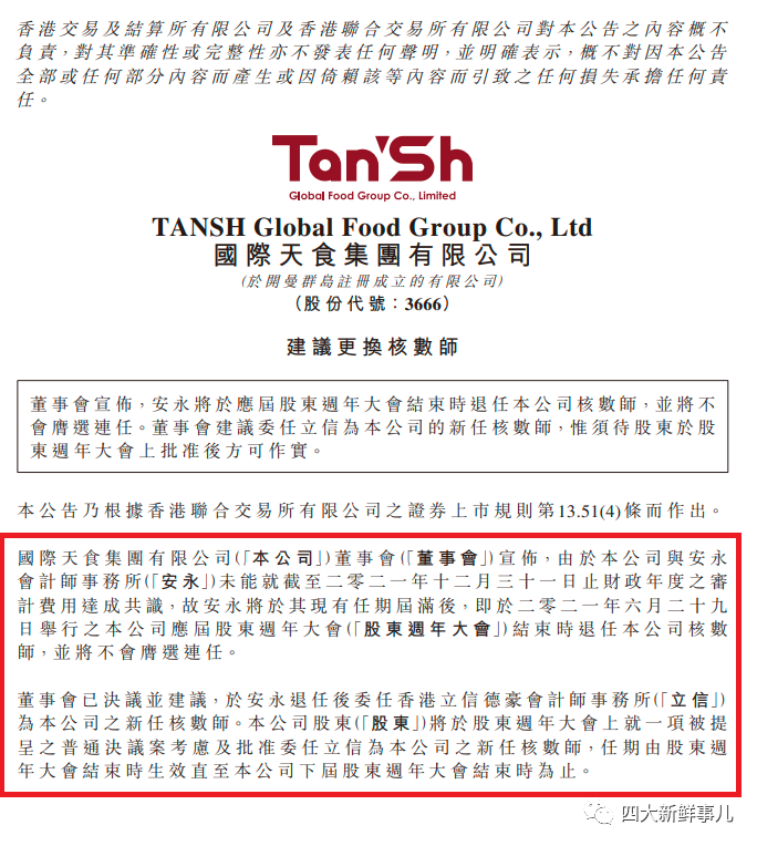国际天食于5月19日发布的《建议更换核数师》显示,由于本公司与安永会计师事务所未能就截至二零二一年十二月三十一日止财政年度之审计费用达成共识,故安永退任本公司核数师。董事会已决议并建议,于安永退任后委任香港立信德豪会计师事务所为本公司之新任核数师。
