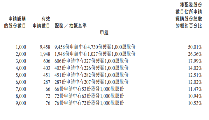 据香港公开发售接获合共14,792份有效申请(包括以白色及黄色申请表格 以及透过中央结算系统向香港结算发出电子认购指示及通过白表eIPO服务提出的申请),涉及合共9507.3万股香港发售股份,相当于根据香港公开发售初步可供认购的香港发售股份总数2000万股约4.75倍。