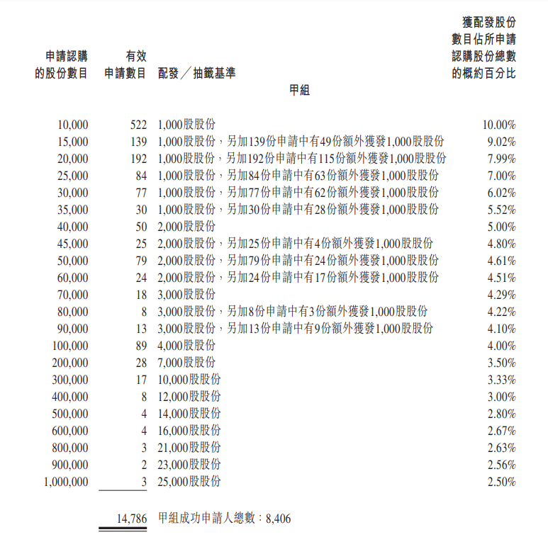 由于香港公开发售的超额认购少于15倍,概无发售股份由国际发售重新分配至香港公开发售。故香港公开发售的发售股份最终数目为2000万股,相当于任何超额配股权获行使前根据全球发售初步可供认购发售股份总数的10.0%。