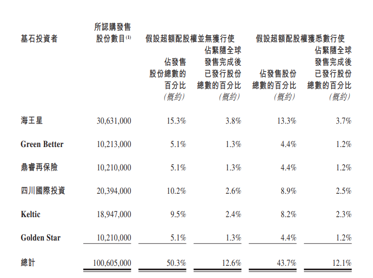 另外,基石投资者海王星、Green Better、鼎睿再保险、四川国际投资、Keltic及Golden Star已分别认购3063.1万股、1021.3万股、1021万股、2039.4万股、1894.7万股及1021万股发售股份,假设超额配股权未获行使,分别相当于全球发售项下发售股份数目的约15.3%、5.1%、5.1%、10.2%、9.5%及5.1%。
