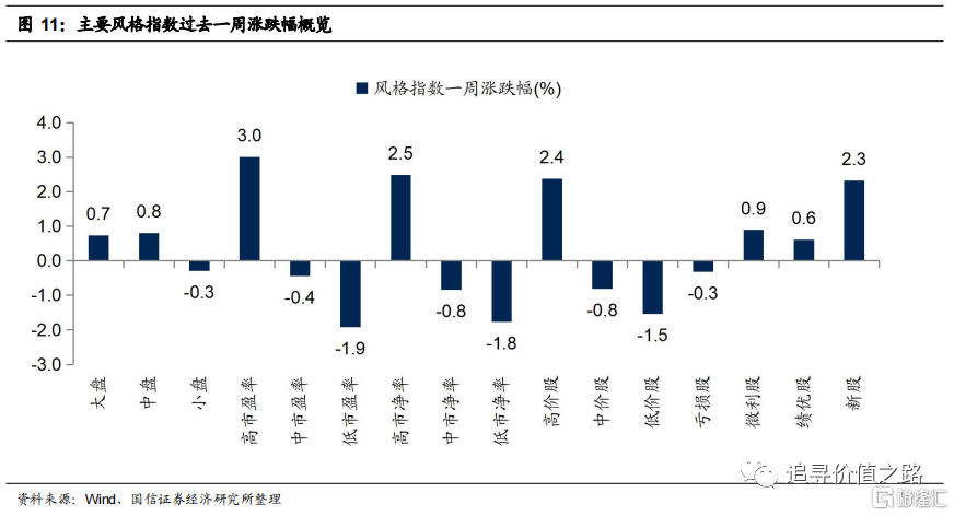 上周市场各风格指数中高估值风格占优。具体来看,上周低市盈率股和低市净率股表现较差,跌幅分别为1.9%和1.8%。而高市盈率股和高市净率股表现较好,上周涨幅分别为3.0%、2.5%。
